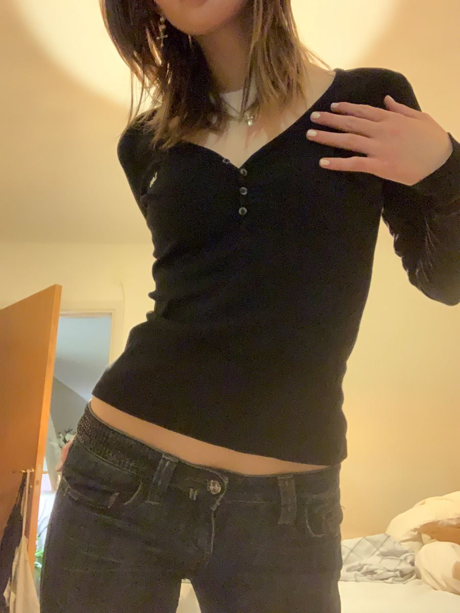 A sleek long-sleeve top made from soft, stretchy knit fabric that hugs your figure in all the right places. Featuring a deep V-neckline with subtle button accents, it’s the perfect blend of minimal and timeless. Perfect when styled with a lace cami for a layered Y2K touch. Dress it down with jeans or elevate it with a skirt for a polished look.